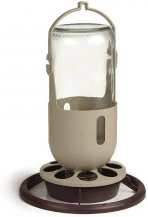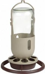 Pothouder glas Een pothouder met glazen pot voor voer of water. Eenvoudig te vullen. De fles kunt u ophangen of gewoon neerzetten. Voor bijvoorbeeld in volieres. De gaatjes in het onderste gedeelte kunt u gebruiken om een verwarmer in te steken, zoda.