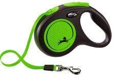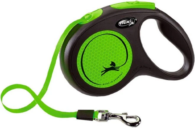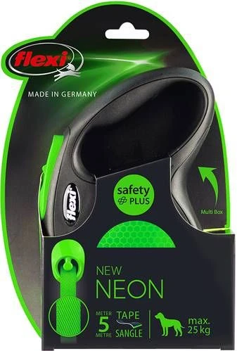 Flexi Rollijn New Neon Tape GroenDe New Neon is de flexi die opvalt. Bij zon door het markante design, in de schemering door haar reflector en altijd positief dankzij haar flexi-kwaliteiten. * Zichtbare veiligheid * Maximale vrije looplengte, 5 meter * Geschikt voor honden tot± 25 kg.