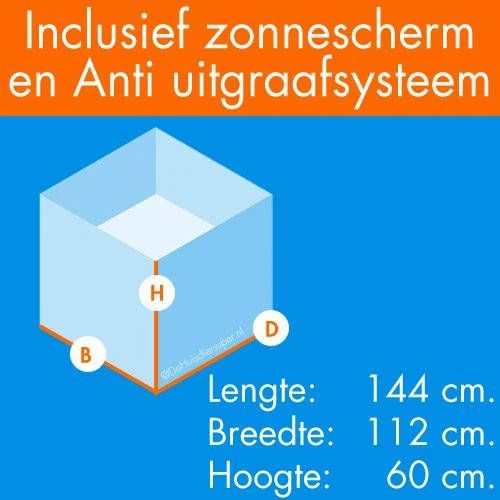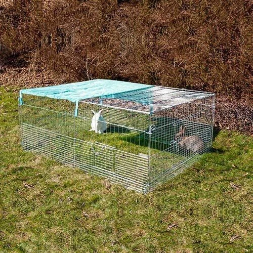 – Afmetingen: 144 x 112 x 60 cm. Ruime verzinkte konijnenren geschikt voor (jonge) konijnen, cavia’s en kippen.