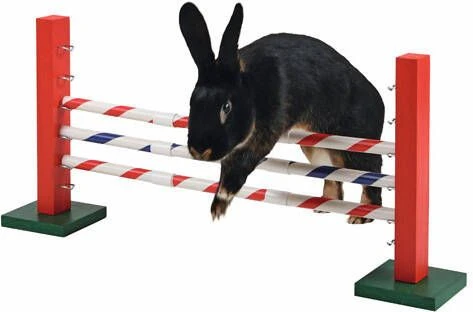 Konijnen Springhorde voor konijn Hop Afmetingen: 70 x 5 x 35 cm. Met deze konijnen horde bouw je eenvoudig je eigen hindernis en daag je konijn uit voor actie. De set bestaat uit 2 houten staanders en 5 kunstof spring paaltjes.