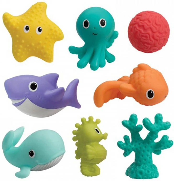 De Infantino Badspeeltjes Bath Squirter zijn 8 leuk badspeeltjes voor in bad en blijven gewoon drijven! De set bestaat uit een goudvis, zeepaardje, zeester, walvais, haai, octopus, koraal en koraal bal. Alle dieren kunnen water spuiten en de verschillende texturen stimuleren de zintuigen van jouw kindje.