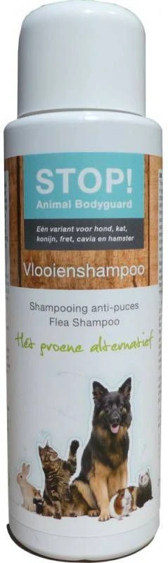 STOP! Animal Bodyguard VlooienshampooDeze shampoo heeft een natuurlijke formule die rijk is aan synergetische plantaardige extracten die een fysiek barrire creren tegen vlooien en teken. Is er sprake van een plaag? Was dan zo snel mogelijk je dier met de shampoo. De shampoo is geschikt voor honden, katten konijnen, fretten, cavia’s en hamsters. Zodra je dier is afgedroogd is het aan te raden om je dier met de STOP! Animal bodyguard druppels te behandelen. En vlo op je dier? Dan zijn er ongeveer 99 in de omgeving. Het gebruik van de omgevingsspray is dan ook aan te raden. * Natuurlijk product * Bevat alo vera * Houdt de vacht frisGebruiksaanwijzing Voor uitwendig gebruik, buiten bereik van kinderen en uit de zon bewaren. Maak je dier nat en verdeel wat shampoo over de vacht. Goed inmasseren en 5 10 minuten laten intrekken en vervolgens uit spoelen.
