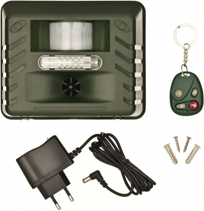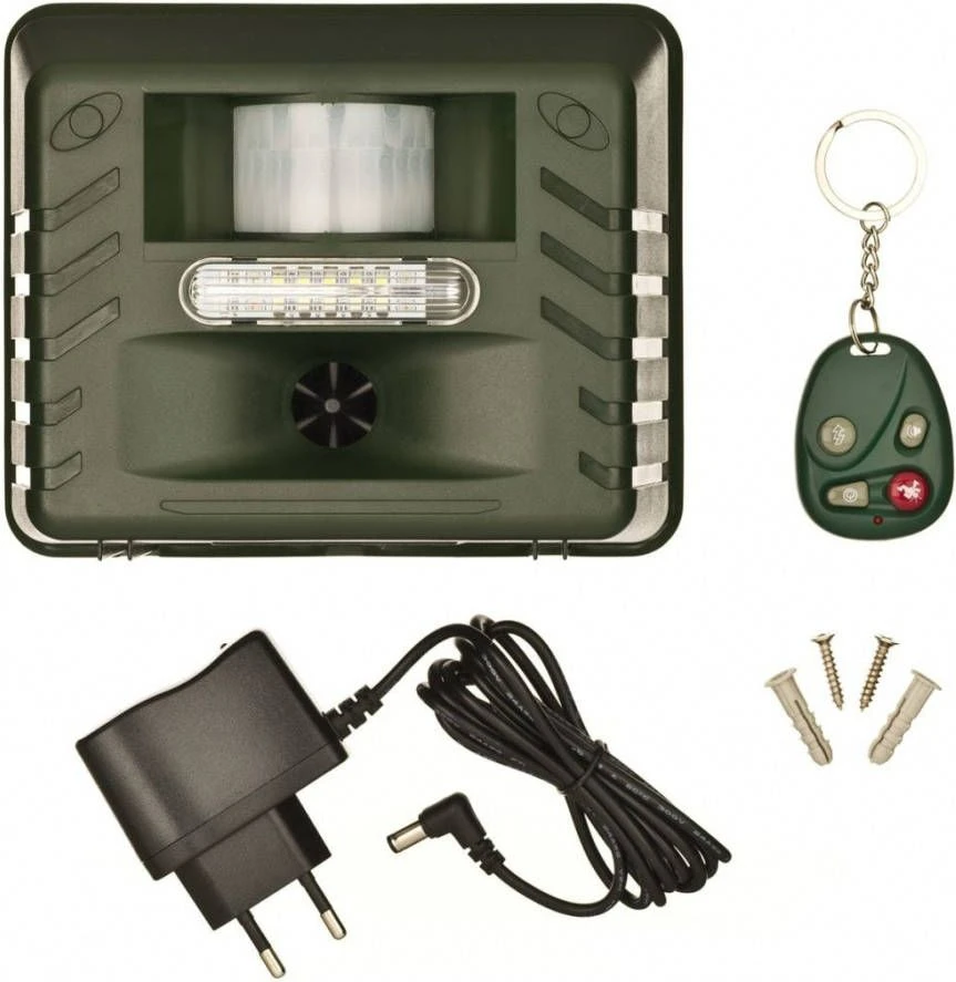 Het ultrasone dierenafweermiddel van Nature is geschikt voor het op een humane en onschadelijke manier afschrikken van dieren die op uw terrein komen. Het apparaat kan een combinatie gebruiken van 3 verschillende eigenschappen om indringers te verjagen: ultrasoon geluid, knipperlichten en een hoorbaar alarm. Het apparaat is effectief tegen katten, honden, vossen, (steen)marters, reigers, duiven, ratten, muizen en andere dieren die worden opgemerkt door de sensor. Het ultrasone geluid is verstelbaar voor 1 of meerdere diersoorten, afhankelijk van het gewenste werkgebied. Het volume van het audioalarm is ook instelbaar. Dit model werkt op 4 1,5 V C-batterijen, deze worden niet meegeleverd. Er wordt wel een afstandsbediening meegeleverd.