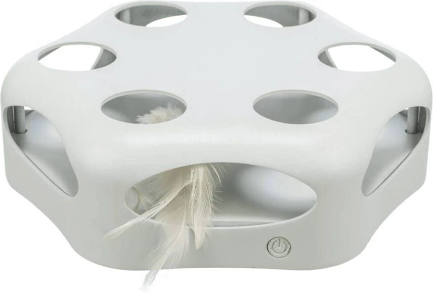Het kattenspeeltje Turning Feather van Trixie stimuleert het natuurlijke jachtinstinct van jouw kat, zorgt voor speelplezier en bevordert gelijktijdig haar behendigheid. Binnenin het zeshoekige huisje zitten animerende veren. Met een druk op de knop in beweging gezet dwarrelen ze wild in het rond, stoppen plotseling en wisselen van richting. Door de verschillend grote openingen aan de boven- en zijkant kan jouw kat de rondtollende buit achternajagen, met de poten aanstoten of proberen te pakken. Omdat de bewegingsafloop van de veren onvoorspelbaar is en de veren altijd op een andere plek uit de openingen tevoorschijn komen, zorgen de Turning Feathers voor gevarieerd speelplezier. Via de ronde en ovale gaten kun je het huisje met kleine snacks vullen en zo het bewegingseffect versterken. De antislip-voetjes zorgen ervoor, dat het speeltje zelfs op gladde vloeren stabiel en veilig staat. Slim ontworpen speeltje voor alle katten voor veel plezier en meer activiteit. Trixie kattenspeeltje Turning Feather in één oogopslag: Actie-speeltje voor katten Animerend: speciaal ontwikkeld om het natuurlijke jacht- en speelinstinct te stimuleren Bevordert behendigheid en activiteit: ronddwarrelende veren animeren om te vangen en aanstoten met de poten Hoge bezigheidsfactor: veren tollen onvoorspelbaar in het rond, stoppen en wisselen van richting, voor gevarieerd en lang speelplezier Slim design: 6-hoekig huisje met verschillende grote openingen, waardoor jouw kat met de poten naar de veren kan grijpen Anti-slip-voetjes voor stevig houvast Met snacks te vullen: stimuleren het spelen extra Makkelijke bediening: met een druk op de knop in beweging te zetten, schakelt automatisch na 15 min uit Batterij-werking: 3 AA-mignon-batterijen, niet bij de levering inbegrepen Kleur: lichtgrijs Materiaal: kunststof, veren Afmeting: Totaal: Ø 22 x H 6 cm Openingen bovenkant: ca. Ø 3,5 cm Openingen zijkant: ca. H 3 x B 8 cm Opmerking: Zoals bij ieder ander speeltje dien je jouw dier bij het spelen hiermee in de gaten te houden. Controleer het speeltje regelmatig op beschadigingen en vervang het als het defect is of onderdelen ontbreken, omdat anders verwonding van jouw dier niet kan worden uitgesloten.