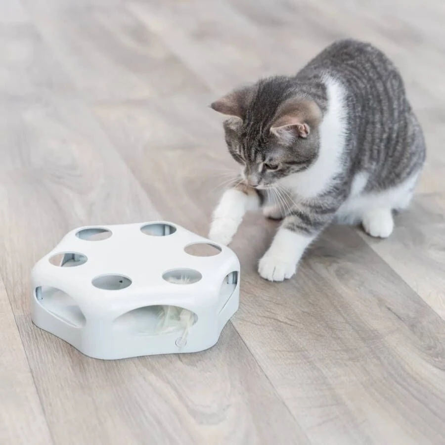 Trixie Turning Feather is uitdagend kattenspeelgoed met een veer, dat gevuld kan worden met beloningen.