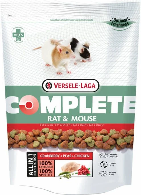 Een uniek concept op de dierenmarkt is het ‘All-in-one’ brokje. De Complete Rat & Mouse van Versele-Laga is een ‘All-in-one’ brokje. Deze bijzonder smakelijke korrel voorkomt selectief eetgedrag. Door het aanbieden van een ‘All-in-one’ brok zorg je ervoor dat jouw rat of muis alle essentiële voedingsstoffen binnenkrijgt. Deze voeding met kip als natuurlijke bron van dierlijke eiwitten en granen voor energie en vitaliteit is specifiek afgestemd op de voedingsbehoefte van ratten en muizen. Het toegevoegde lijnzaad draagt bij aan een goede opname en vertering. Door de optimale textuur van de brokjes zorgen ze voor een extra tandreiniging en geven tandplak minder kans. De voeding is verrijkt met erwten en veenbessen. Versele-Laga Complete Rat & Mouse is ontwikkeld door dierenartsen en gebaseerd op wetenschappelijke inzichten.