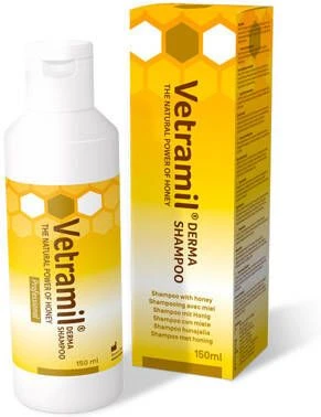 Vetramil Derma Shampoo Vetramil Derma Shampoo is speciaal ontwikkeld voor honden met een geprikkelde huid. De pH waarde van de shampoo is afgestemd op zuurgraad van de hondenhuid en tast de natuurlijke vetlaag niet aan. De shampoo bevat een honing die rijk is aan enzymen. * Voorkomen van beschadiging aan de voetzolen * Mag gebruikt worden vanaf 6 weken * Mag regelmatig gebruikt worden * Ook geschikt voor katten en paarden.