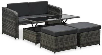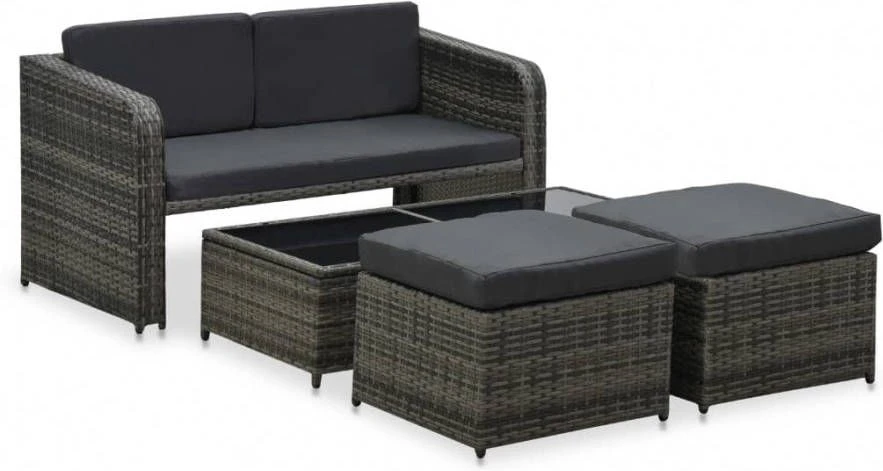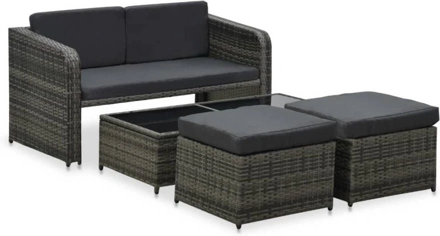 4-delige Loungeset met kussens poly rattan antraciet. De set is gemaakt van stevig gepoedercoat staal en hoogwaardig PE ratten, dit maakt deze set enorm duurzaam. De dikke verwijderbare kussen zijn erg comfortabel. Het speciaal ontworpen uitvouwsysteem in de salontafel heeft een glazen tafelblad, dit maakt hem eenvoudig schoon te maken met een vochtige doek.